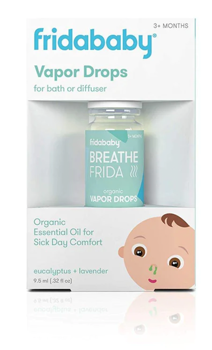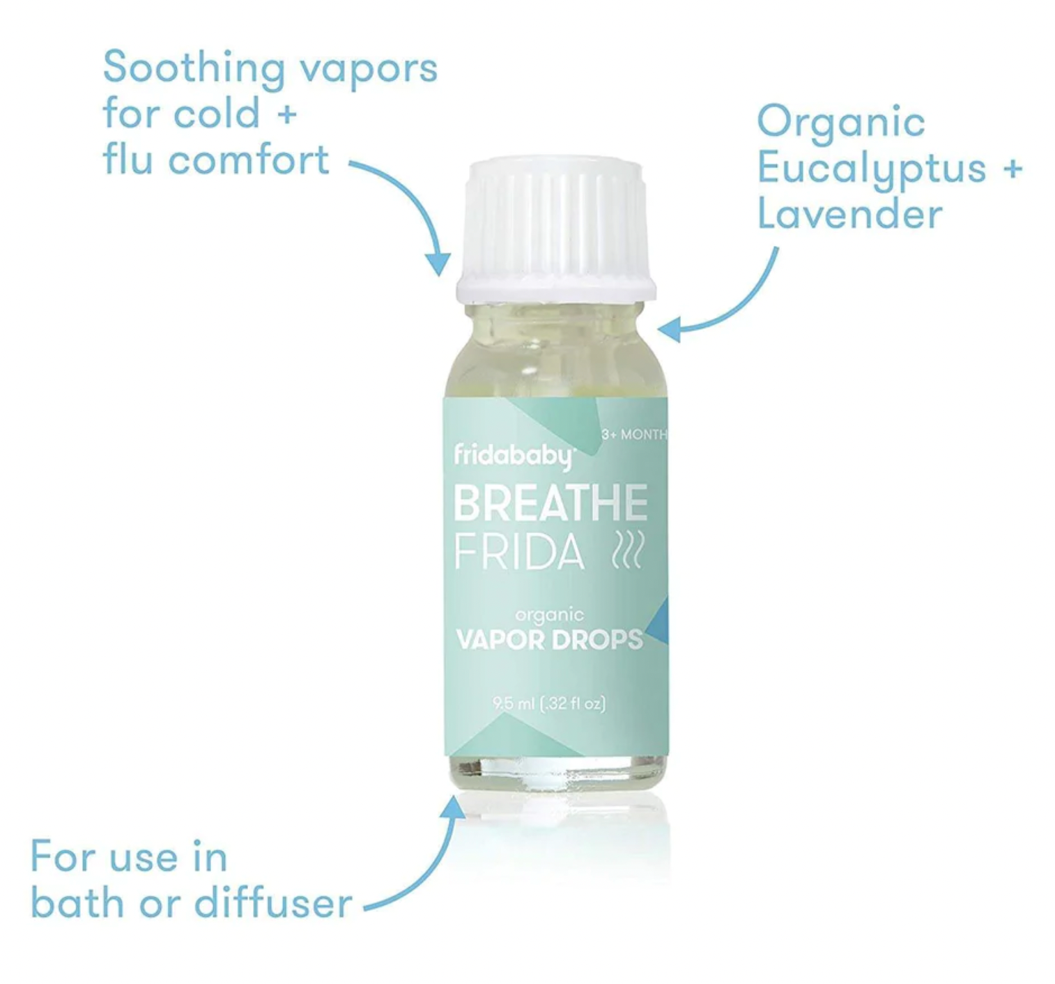 Fridababy's BreatheFrida Vapor Bath Drops deliver cold and flu season comfort with organic eucalyptus and lavender oils that help baby keep calm and breath easily. Simply drop in to warm bath water or place a few drops into a diffuser.